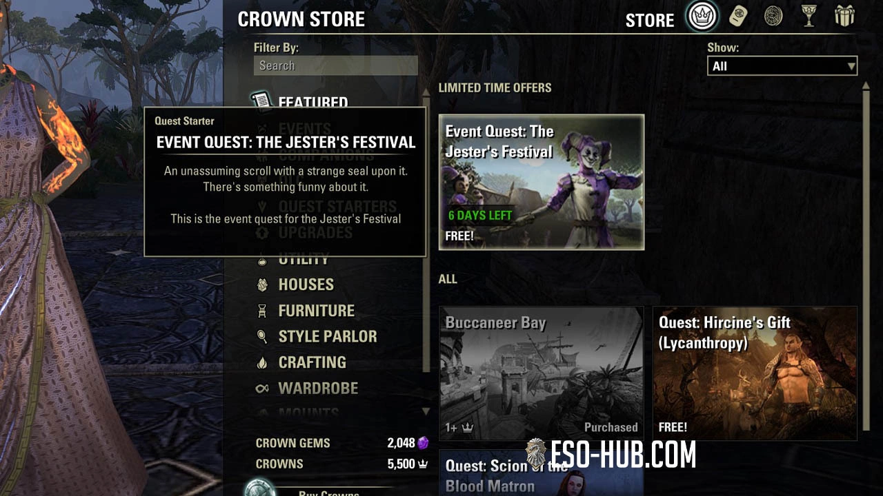 During Events, the Crown Store will have limited time cosmetics for you to purchase. Here is a list of all ESO Jester's Festival Crown Store offerings that are usually available: