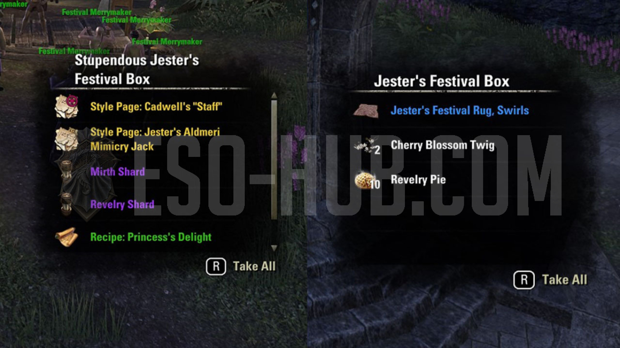 Jester's Festival also gets new Jester themed furnishing that you can acquire as a drop from Jester's Festival boxes. You can also purchase these furnishings from Holiday Achievement Vendors found in Grahtwood - Elden Root, Stormhaven - Wayrest or Deshaan - Mournhold (in the banks basement).