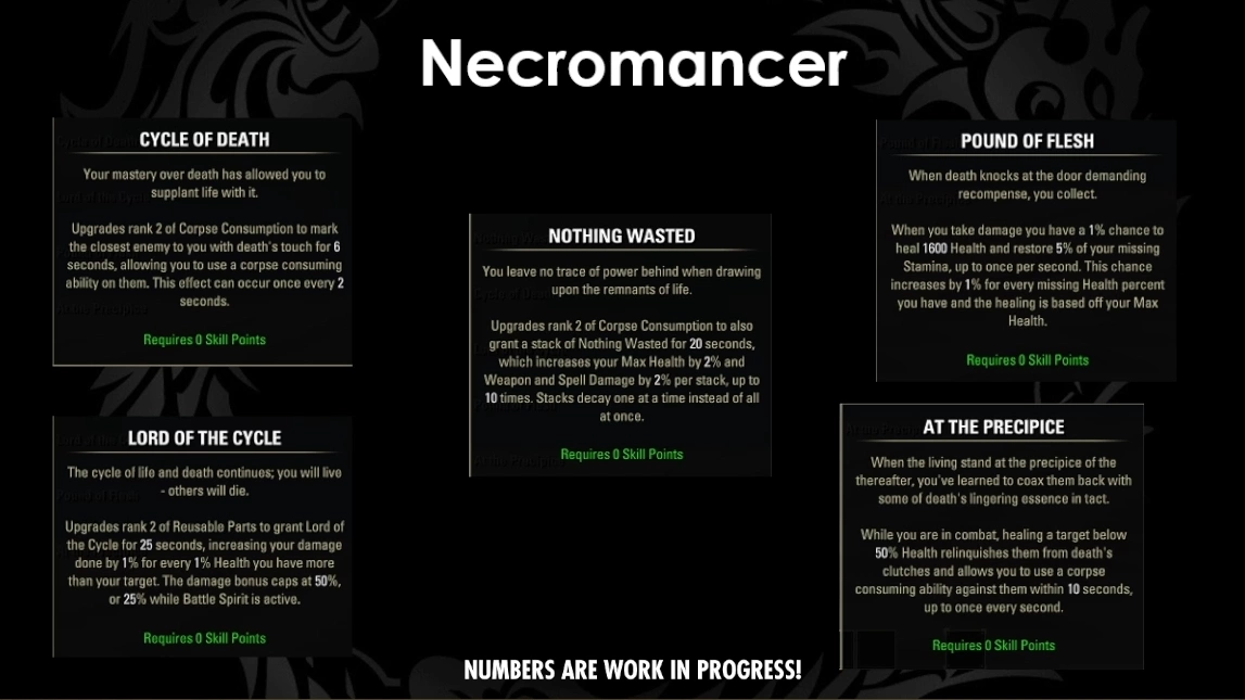 Necromancers Class Mastery Passives in ESO now take the Corpse mechanics even further. You can now mark living enemies as corpses, letting you use corpse abilities in fights where no corpses exist. New tech lets buff stacks drop off one at a time instead of all at once. Tank, healer and execute options round out the set.