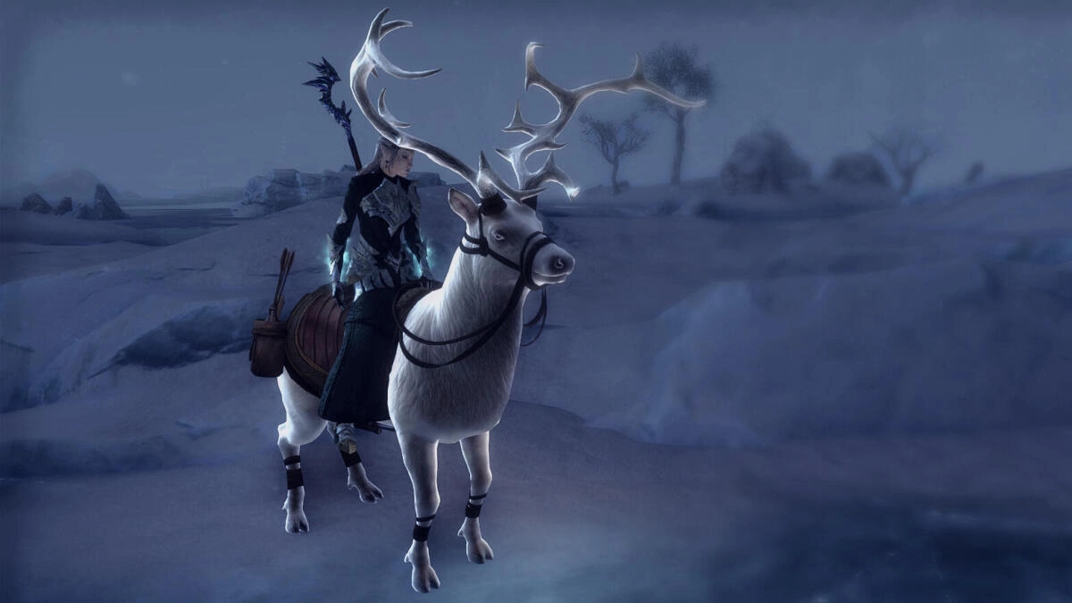 L'éclat de la lune se reflète sur les flocons de neige pendant un rituel visant à imprégner un élan blanc de l'intelligence d'un fantôme capturé dans les mers glacées près de Jehanna... s'il faut en croire le folklore de Hauteroche. Que ce soit vrai ou non, ce destrier comprend davantage de choses qu'on ne s'y attend.